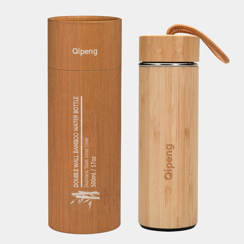 Garrafa de água de bambu de aço inoxidável com tampa à prova de vazamento, garrafa de parede dupla personalizada